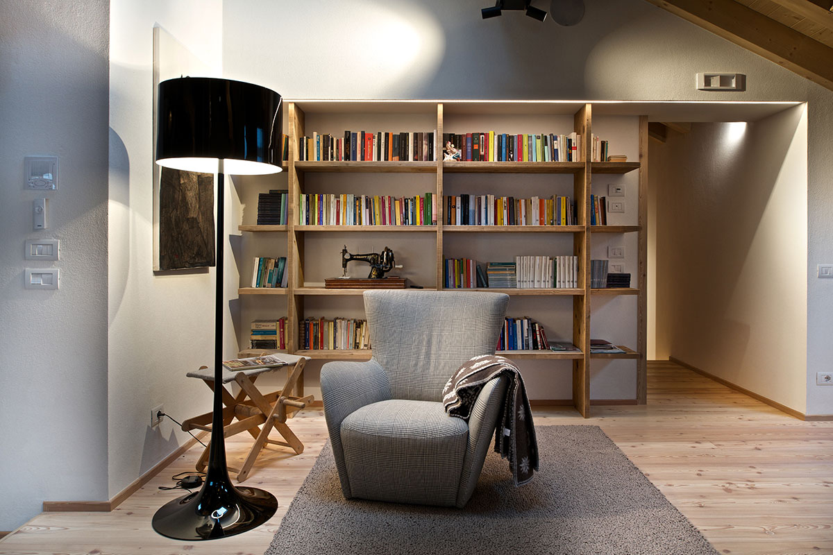 Per la libreria, che fa da scenografia all’angolo lettura, è stato utilizzato un legno antico recuperato e trattato. La struttura è composta da tre elementi verticali portanti a tutta altezza che sostengono i ripiani, passanti senza schienale, con parete bianca a vista in contrasto e illuminata da fascia led incassata a filo nell’abbassamento in cartongesso sovrastante.